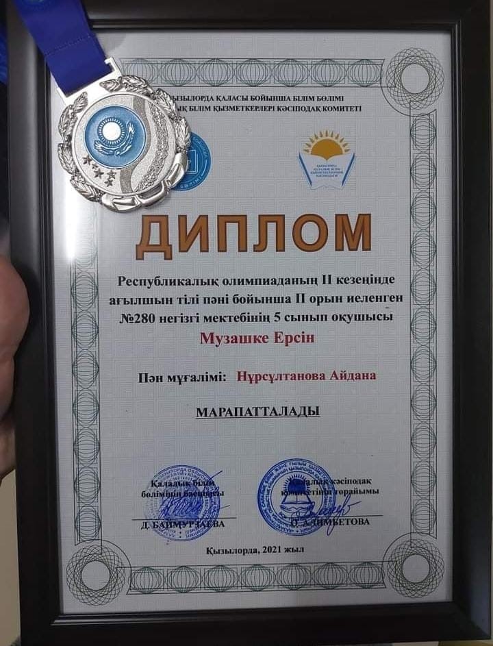 Мектебіміздің мақтанышы 5 сынып оқушысы Музашке Ерсін Республикалық олимпиаданың II кезеңінде ағылшын тілі пәні бойынша ll орын иеленді. Пән мұғалімі Нұрсұлтанова Айдана. Құттықтаймыз Бәрекелді